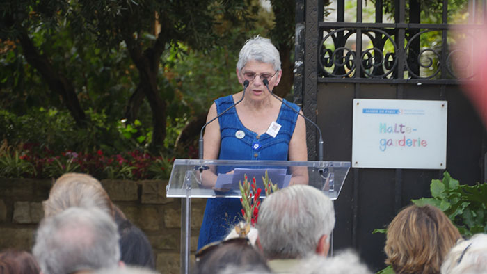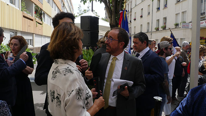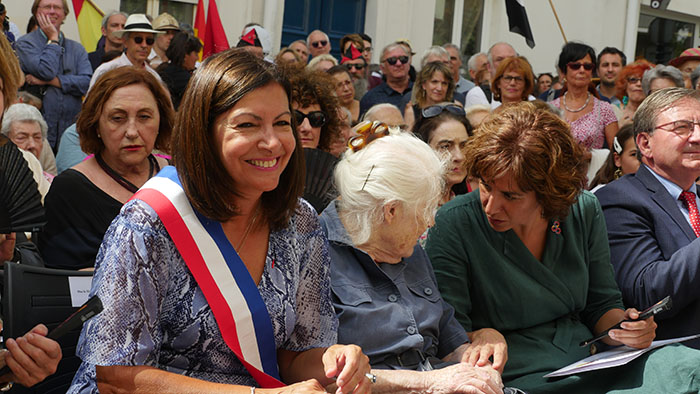 Puis nous nous sommes dirigés vers la rue de Lobau, jardin dédié aux combattants de la Nueve. Cette année, nous avons inauguré la plaque offerte par Manuela Carmena, ex-maire de Madrid, qui est le duplicata de la plaque du jardin de Madrid, que Manuela Carmena a dédié en 2017 aux combattants de la Nueve. Nous tenons à bien préciser cela car Manuela Carmena durant tout son mandat a oeuvré pour la mémoire historique, par ce jardin mais également en débaptisant des rue de Madrid encore à la gloire des franquistes. Et bien entendu , il serait déplacé d’imaginer un instant que la mairie de Madrid de 2019 (droite alliée au parti fasciste VOX) aurait pu faire un tel présent à la ville de Paris et surtout que nous aurions accepter de l’inaugurer. Merci à Manuela Carmena! Lorsque nous sommes parvenus rue de Lobau, un petit groupe d’oiseaux, de ces volatiles qui ont pour usage de s’installer dans les pénates des autres, des coucous, étaient sur place. Il a fallu les cantonner légèrement mais heureusement, l’hommage s’est déroulé comme prévu. Et bien sûr puisque nous avions, de l’Espagne, une ministre, un sénateur, des ambassadeurs, nous en avons profité pour leur demander d’être actifs dans la réforme de la loi mémorielle de 2007 en y apportant plus de justice, de reconnaissance pour les victimes du franquisme, et de condamnation pour les bourreaux et l’annulation des sentences prononcées par les tribunaux franquistes. Notre invitée de la fédération Memoria Libertaria, a insisté également sur cet aspect de la préservation de la mémoire historique en Espagne. Dolores Delgado, ministre de la justice espagnole, a repris ces thèmes dans son intervention, assurant que son gouvernement mettra tout en oeuvre pour aller plus loin dans la reconnaissance des victimes du franquisme et contre l’impunité des bourreaux. Puis tout à coup, elle déclara qu’elle était persuadée que les hommes de la Nueve auraient soutenu la constitution de 1978, qui justement pose une chape de silence sur l’histoire en épargnant à ces hommes du franquisme des poursuites devant la justice. Elle souleva un tollé qui mit quelque piment dans la cérémonie… Anne Hidalgo, maire de Paris, vint à la rescousse, déclarant Paris ville de dialogue où tout était possible dans la polémique et la controverse. Une journée bien remplie qui s’est achevée pour nous, les Musicos et plein d’autres participants au 33 rue des Vignoles où nous avions préparé un petit rafraîchissement convivial. 2020, année des élections municipale en France, nous vous donnons rendez-vous envers et contre tout pour maintenir vivant la mémoire du combat pour la Liberté!