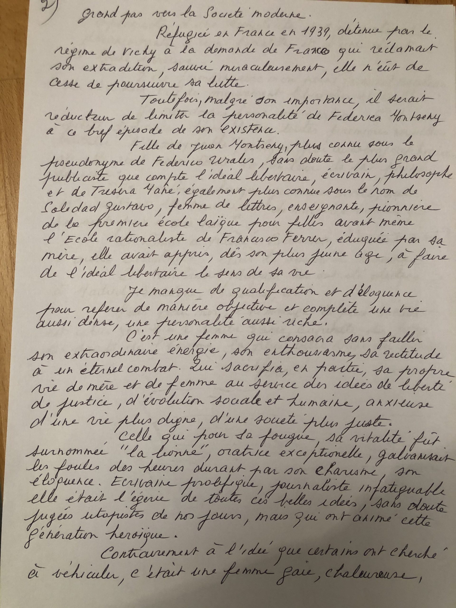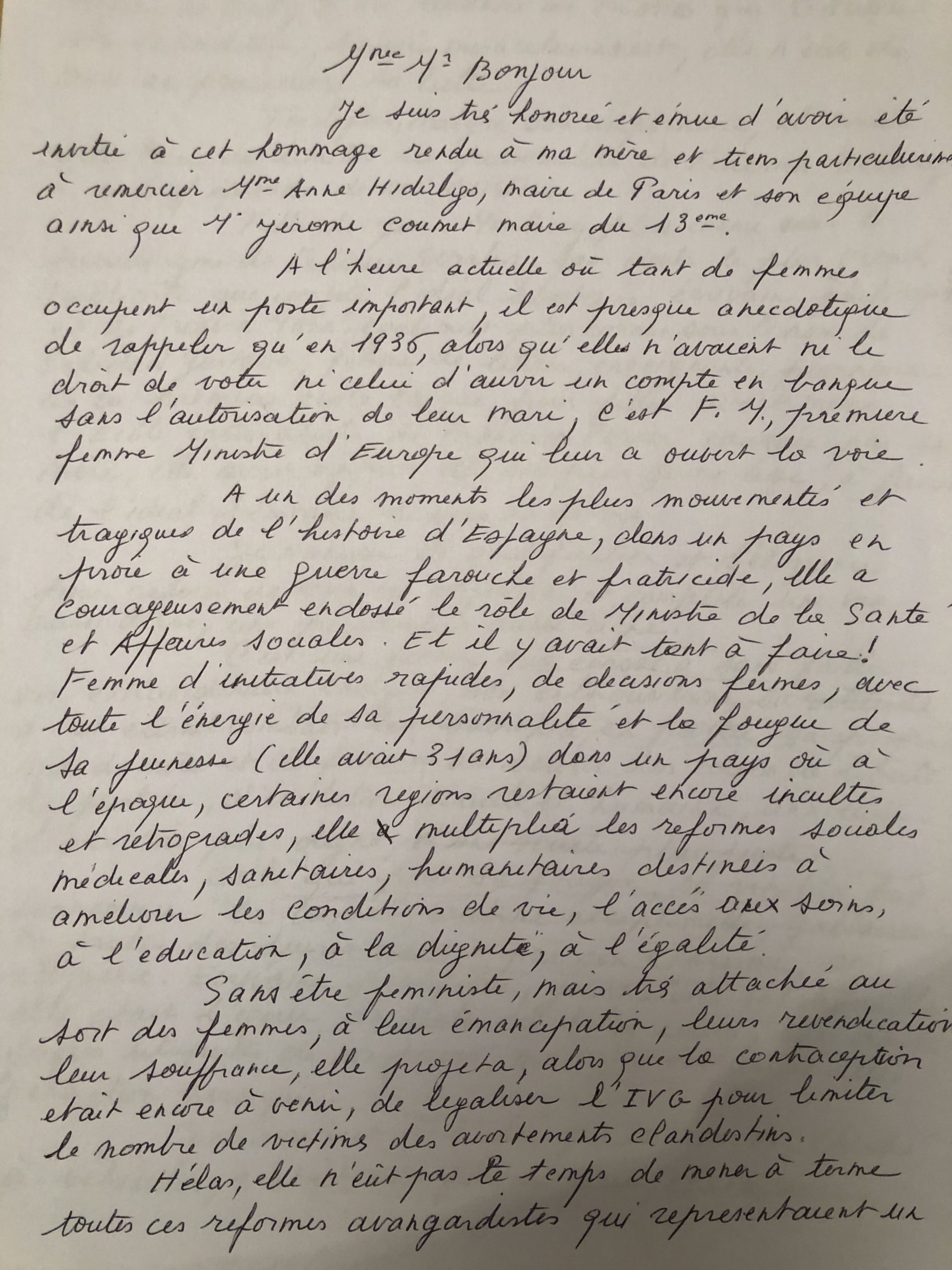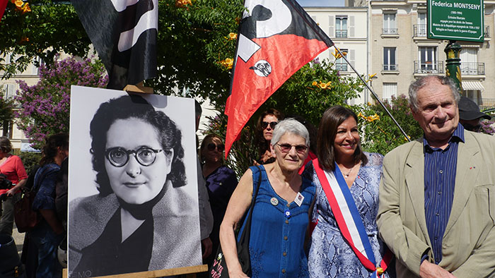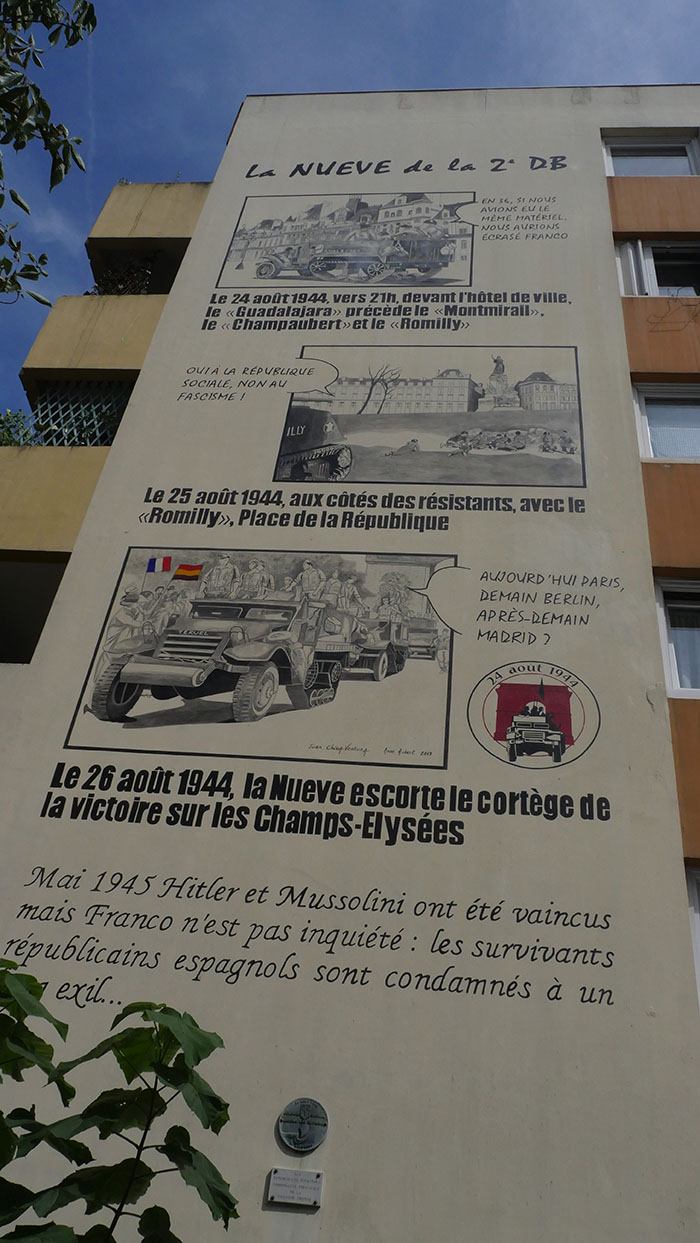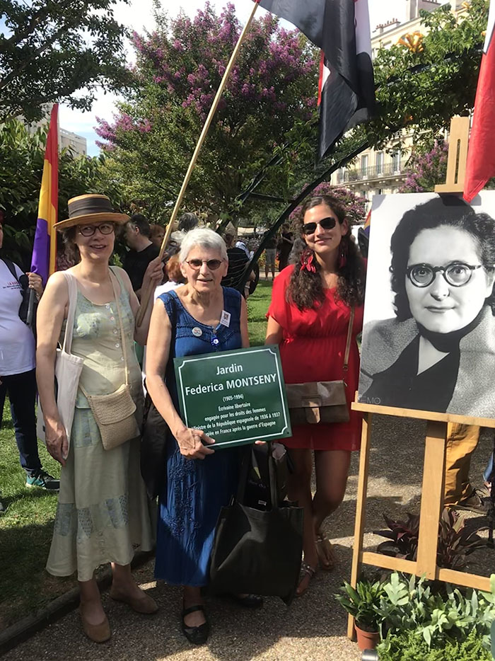 Vous pouvez toujours vous les procurer auprès de notre association, ainsi qu’un recueil de l’ACTL « Libération de Paris historique et philatélique. » Où les actes liés à la libération de Paris sont détaillés arrondissement par arrondissement. À 14h, nous avons gagné la rue Esquirol dans le 13e arrondissement où devant la peinture murale attendait une foule de descendants des exilés espagnols, de sympathisants de ce peuple combattant, des curieux également heureux d’apprendre un passage occulté de l’histoire de cette ville, et bien entendu nos amis anarchistes et ceux de la CNT espagnole en exil et CNT française. Très vite nous avons été rejoints par La Charanga Ventolin , fanfare venue des Asturies pour fêter à nos côtés les Hommes de la Nueve et revendiquer une autre république pour l’Espagne, une république sociale et solidaire. Les délégations des officiels sont arrivées avec Anne Hidalgo, Maire de Paris, Dolores Delgado ministre de la Justice espagnole, Irene Lozano représentante de ‘L’Espagne Globale » (terminologie pour le moins mystérieuse et entourée de circonvolutions…), Fernando Martinez sénateur et ex directeur de la mémoire historique, l’ambassadeur d’Espagne en France, l’Ambassadeur d’Espagne à l’UNESCO, celui de l’OCDE et probablement encore d’autres personnalités dont je ne connais ni le titre ni le nom… et le maire de l’arrondissement J Coumet. Mais pour nous l’essentiel était bien entendu tous ces anonymes, venus simplement, parfois de très loin, rendre les honneurs aux hommes de la Nueve et découvrir pour l’occasion la peinture murale de 17m de haut réalisée par Juan Chica Ventura (aidé dans ces travaux par Anne Aubert artiste peintre, et par Claire Lartiguet comme petite main). Les orateurs se sont succédés à la tribune autour de cette réalisation monumentale. (voir la vidéo réalisée par nos amis: Victor Simal et Richard Prost) Puis Vida Gambier, fille de Federica Montseny est venue parler de sa maman (voir document Porte folio), ministre de la santé sous la république espagnole de novembre 1936 à mai 1937 et à laquelle la ville de Paris a dédié un jardin place Louis Armstrong (Paris 13e) , (juste à une vingtaine de mètres de la fresque de la Nueve rue Esquirol). La ville de Paris, à travers Federica Montseny, rend hommage aux combat des femmes dans toutes les époques de bouleversements historiques. lors de l’inauguration de ce jardin, la mairie de Paris, a offert à notre association une plaque de ce lieu. Ce qui pour nous a un sens très symbolique, Federica Montseny étant une figure historique du mouvement anarchiste espagnol que beaucoup d’entre nous ont eu l’occasion de croiser à Paris ou à Toulouse.