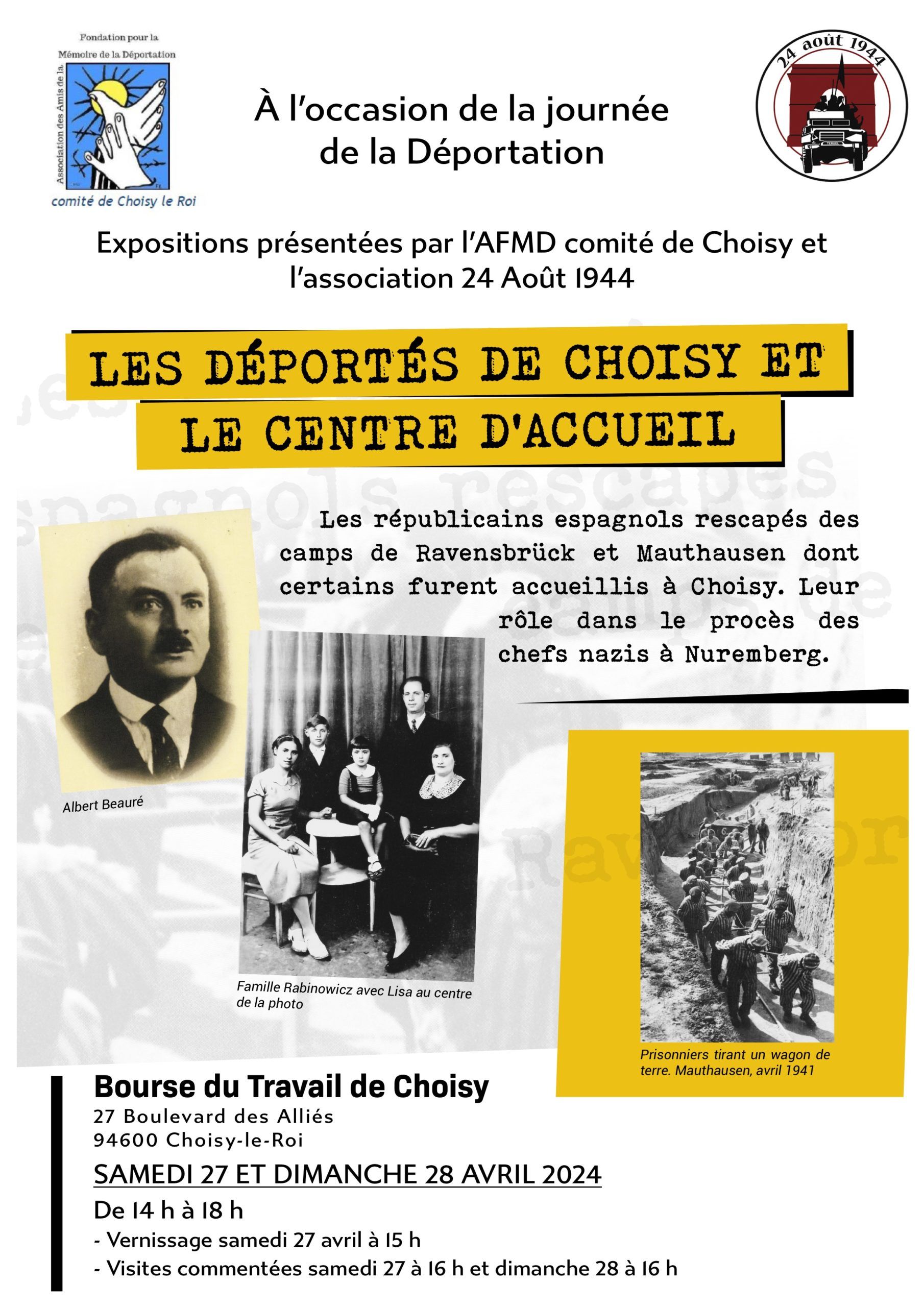 EXPOSITIONS présentées par l’AFMD comité de Choisy et l’association 24-Août-1944 Les déportés de Choisy et le Centre d’Accueil. Les républicains espagnols rescapés des camps de Mauthausen et Ravensbrück;  dont certains furent accueillis à Choisy. Leur rôle dans le procès des chefs nazis au procès de Nuremberg