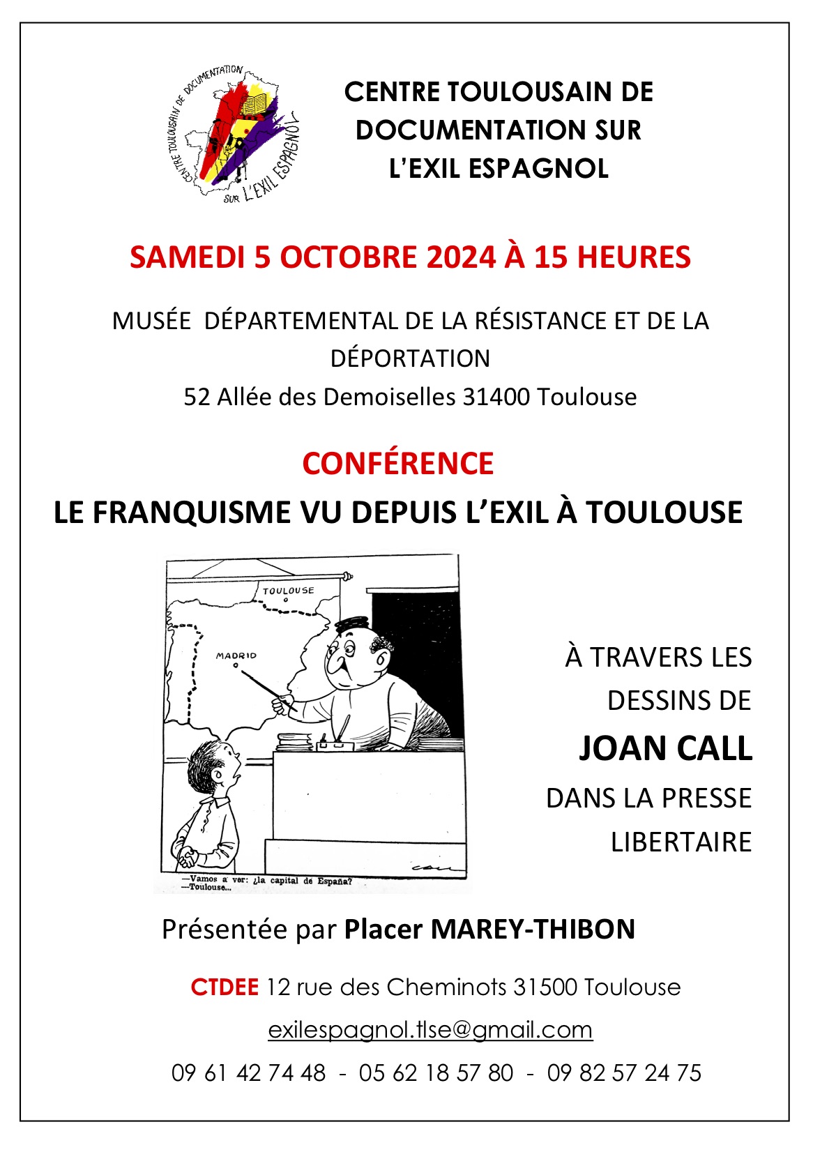 – le 5 octobre à 15h au Musée de la Résistance à Toulouse ( au 52 allée des demoiselles) et dans la continuité de l’exposition « Anatomie du franquisme » (qui se tient actuellement au Musée, le CTDEE propose une intervention sur
