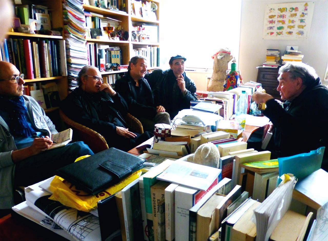 Tant de souvenirs reviennent en mémoire. Sur ces photos, la première réunion, le 28 juin 2014, dans son bureau, lorsqu’il a accepté de nous accompagner dans l’aventure de la Nueve… Sur la deuxième photo, il est sur scène, chez lui, à la Parole errante, avec nous, saluant les personnes qui sont venues découvrir le montage théâtral des paroles des combattants de la Nueve… C’était le 24 août 2014.