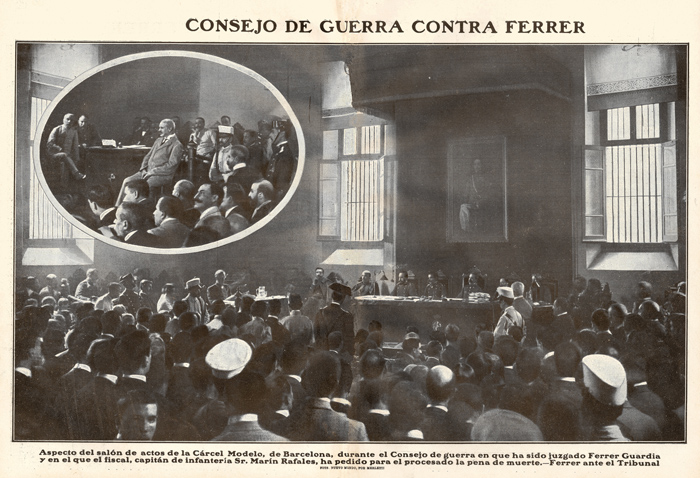 Les classes dirigeantes et possédantes étant majoritairement de droite et catholique, il fallait trouver un coupable pour faire oublier leur crasse politique et morale. Ce fut Ferrer Guardia. Un tribunal militaire le jugea à la hâte, à partir de témoignages tellement peu probants que l’avocat militaire commis d’office, dénonça cette procédure. La sentence était prévisible et la condamnation à mort fut la fusillade le 13 octobre 1909.