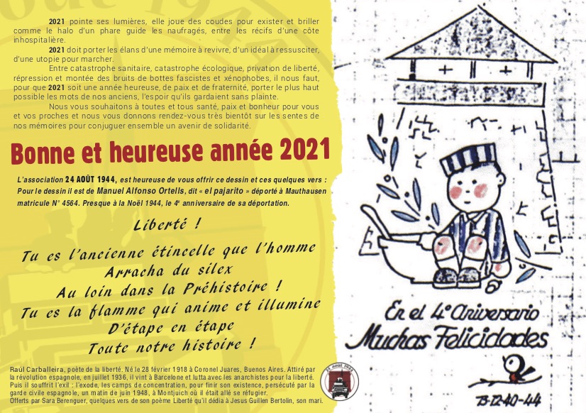 © dessin de Manuel Alfonso Ortells , El Pajarito, presque qu’à la Noël 1944. Il ne savait pas encore qu’il ne passerait pas d’autre Noël en enfer mais il espérait à travers le trait de son crayon clandestin! L’association 24 août 1944 vous présente ces voeux de paix, liberté & santé pour 2021 La Asociación 24 de agosto de 1944 les desea paz, libertad y salud para el 2021