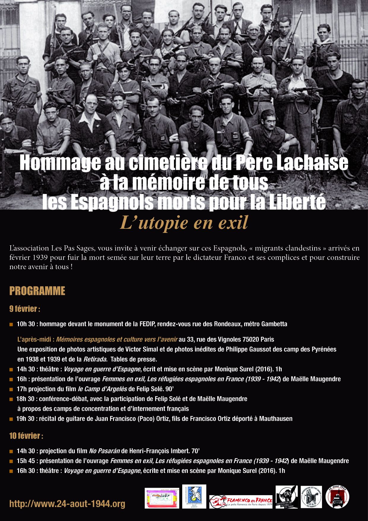 L’année 2019 sera nécessairement l’année, de l’évocation de La Retirada, l’exode des 500 000 républicains espagnols qui, après 32 mois de combat, seuls contre les militaires factieux dirigés par Franco, aidés par les régimes fascistes européen, furent accueillis – trop souvent dans des conditions indignes – par la France frileuse de 1939. Ni victimes ni martyrs, ils étaient emplis d’espoir et de convictions, épris de liberté et de justice sociale. Ils menèrent leur combat pour leurs idées jusqu’au bout de leur existence, dans la Seconde Guerre mondiale mais aussi jusqu’à la disparition du dictateur espagnol, Franco. « Peut-être, après tout, n’avons-nous jamais appris à faire la guerre. De plus, nous étions à court d’armement. Mais il ne faut pas juger les Espagnols trop durement. C’est fini : un jour ou l’autre, Barcelone tombera. Pour les stratèges, pour les politiques, pour les historiens, tout est clair : nous avons perdu la guerre. Mais humainement, je n’en suis pas si sûr…Peut-être l’avons-nous gagnée . » Antonio Machado, janvier 1939. L’association 24 août 1944 et la mairie de Paris, vous invite tout au long de l’année 2019 à découvrir pourquoi et comment des Espagnols de toutes conditions, sont arrivés en exil il y a 80 ans. Pourquoi et comment ils ont pris part aux luttes contre le fascisme et pour la liberté là où ils se trouvaient. Pourquoi et comment ils ont continué, seuls, à lutter contre la dictature franquiste qui sévissait en Espagne. Notre premier événement: les 9 et 10 Février 2019 Nous voulons cette année expliquer pourquoi ces Espagnols étaient là et surtout ce que représentait leur combat politique pour l’avènement d’une société plus juste, plus solidaire. Les traces qu’ils ont laissées sont si profondes dans la pensée des peuples qu’aujourd’hui encore beaucoup se réclament de leur idéal. Le 9 Février : un Hommage aux républicains morts pour la liberté, le 9 février à partir de 11h00, devant le monument de la FEDIP dédié à ces Espagnols antifascistes au cimetière du Père Lachaise. Métro Gambetta Rendez-vous est donné à l’entrée du cimetière du Père Lachaise, rue des Rondeaux, (métro Gambetta) à 10h30. Pour ensuite aller en cortège vers le monument. La Mairie de Paris, Le gouvernement espagnol, Les amis de Fondation pour la Déportation (AFMD75) et l’association Mémoire Histoire des républicains espagnols (MHRE89 ) s’associent à cet hommage. Et l’association Les Pas-Sages du 33 rue des Vignoles organise avec toutes ses composantes, les 9 et 10 février, deux après-midi festifs avec exposition de photos de inédites sur la Retirada et les camps en France de Philippe Gaussot.http://www.gaussot.eu/textes/biographie_phg.html Et les photos artistiques de Victor Simal. théâtre, présentation d’ouvrage, projection et débat récital de guitare au 33 rue des Vignoles, 75020 Paris, siège historique de la CNT espagnole en exil et futur centre mémoriel du mouvement libertaire espagnol et français. (voir programme) Nous comptons sur votre présence. À très bientôt pour ces moments d’émotion et de mémoire.