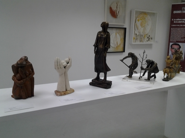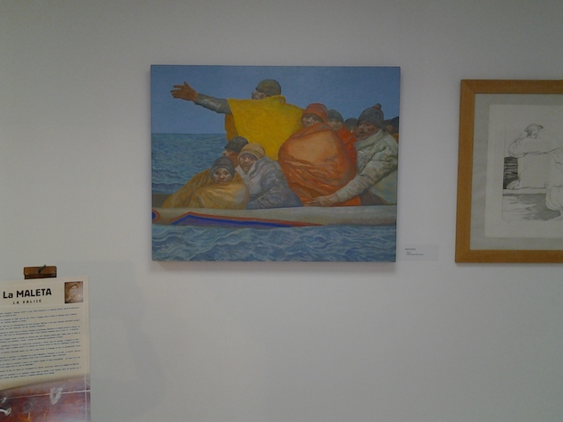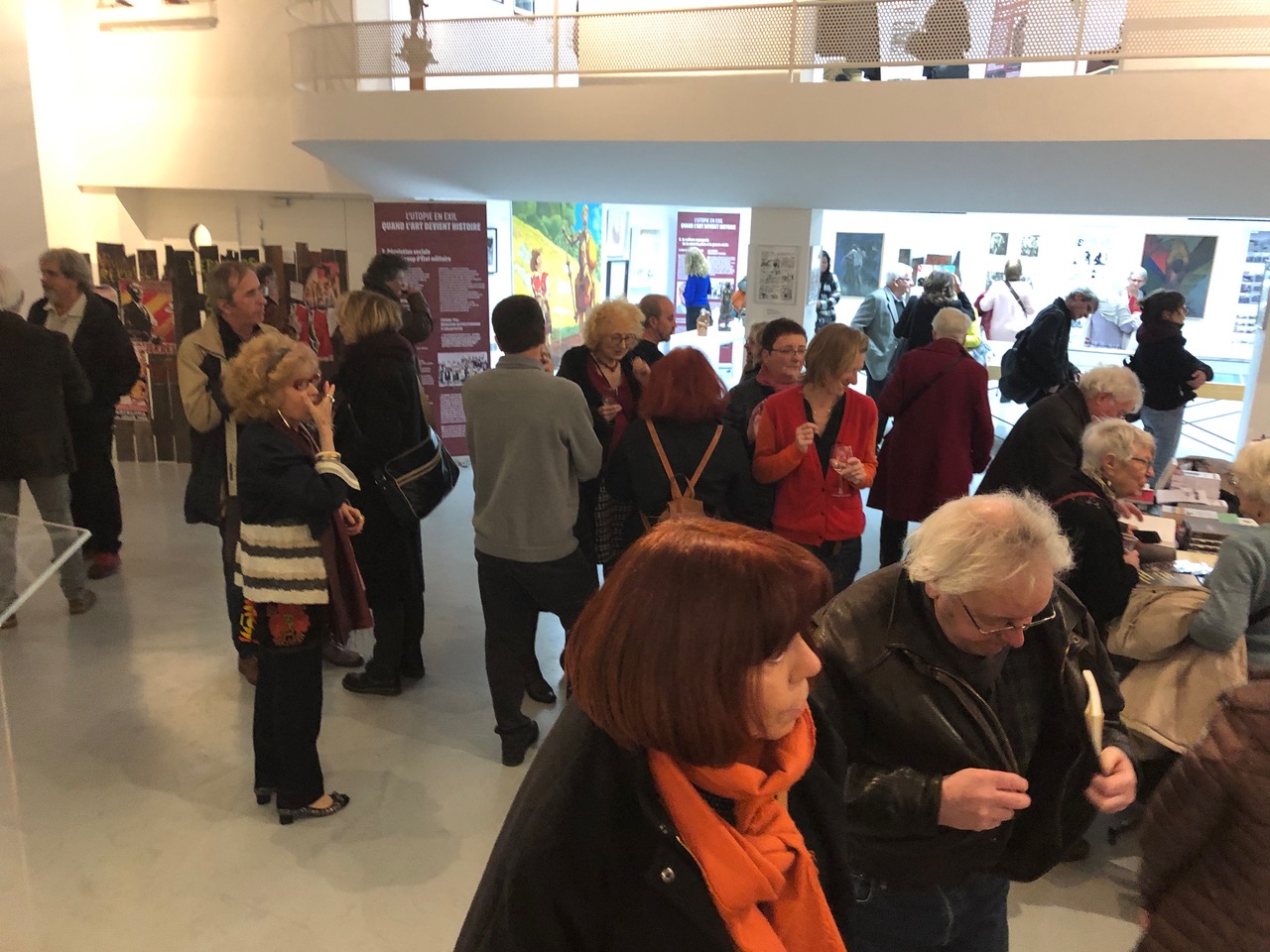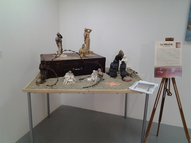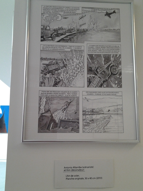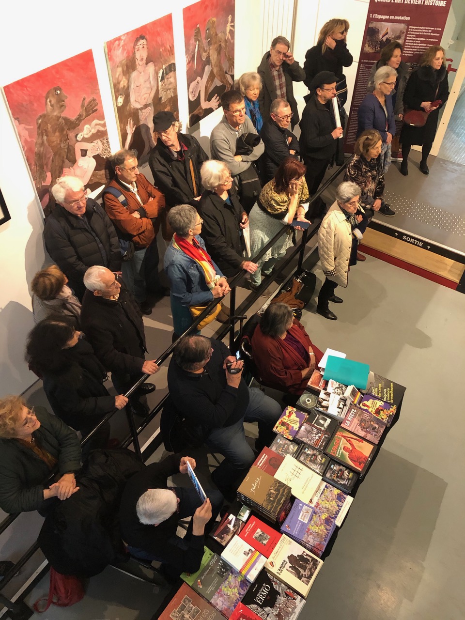 Notre propos était de démontrer combien cet épisode sans équivalent dans l’histoire sociale populaire de l’Espagne, d’Europe et même du monde a imprégné, impressionné et impressionne toujours les créateurs et artistes de tout art. À travers des peintures, des sculptures, des dessins, des planches originales de bandes dessinées, des objets rendus vivants et libres par des mains de prisonniers et de prisonnières, 33 artistes nous ont invités à découvrir leur univers pour nous conter, à leur façon, la révolution espagnole, le bouleversement social qu’elle a générée, la guerre contre le fascisme européen, l’exil et la résistance à toute dictature. Ce 5 novembre, nous étions nombreux dans ce lieux inhabituel pour nous, qu’est l’institut Cervantès. Plus de 250 personnes sont venues admirer ce foisonnement de couleurs, de matière, et d’expression. Parmi cette foule, il y avait ceux qui enfants ou jeunes adolescents avaient passé la frontière des Pyrénées en février 1939. Heureux de pouvoir amener leur art au coeur même de l’Espagne, pouvoir s’exprimer à travers lui et dire enfin aux présents et à tous ceux qui l’entendront : « Nous rentrons chez nous! Mais nous ne venons pas seuls, nous apportons, pour vous raconter notre histoire jusqu’ici étouffée, notre art, nos créations qui parleront pour nous. Et mieux qu’un discours, elles seront l’expression de notre Liberté conquise au prix de celle de nos parents. Elles diront à toutes et tous enfin, combien ils ont résisté et comment leur idéal leur a survécu. » C’est ce que nous a dit avec tant de douceur José Torres (sculpteur, 94 ans, 14 ans quand il fait connaissance avec le sable des plages du Roussillon); Leonor Fabra, (86 ans, elle en a 6 quand elle passe la frontière avec ses parents) fille du sergent Fabra qui à Valence a empêché les militaires de sa caserne de se soulever. Ce fut aussi le message que Joan Jordà, 90 ans, (10 ans quand il se retrouve en camp d’internement, sa famille est éparpillée dans d’autres camps) nous a adressé de Toulouse, trop fatigué pour se déplacer, il a tenu participer par ses oeuvres à cette exposition, et à saluer l’ensemble des artistes et les membres de notre association. Toutes et tous, des plus âgés aux plus jeunes, ces artistes ont volontairement exposé dans cet espace, qui appartient au gouvernement espagnol, comme une victoire sur le silence et le mépris. L’utopie qui dès 1936 a guidé les actes de leurs ainés vers la construction d’une société plus juste, plus partageuse, cet idéal qui ne les a jamais abandonné tout au long de leur existence, ils ont souhaité les exposer ouvertement, sans censure ni retenue. Face aux représentants de ce gouvernement espagnol qui est le premier depuis 80 ans à s’intéresser à la mémoire de l’exil républicain: Socorro Prous Zaragoza, Directora División Coordinación Administrativa y Relaciones Institucionales.DG para la Memoria Histórica; Lorenzo Escuredo Castellanos, Vocal Asesor del Gabinete Técnico de la Subsecretaría, Ministerio de Justicia; et au directeur des lieux Sr Domingo García Cañedo, nous avons pu exprimer d’une part nos remerciements pour leur accueil et pour avoir faciliter la tenue de notre exposition et d’autre part nous avons exprimé nos inquiétudes quant à la politique mémorielle en Espagne où l’impunité des bourreaux reste entière et où les opposant au franquisme sont empêchés de porter plainte contre les auteurs des violences qu’ils ont subi. Tout comme Charo Arroyo, de la CGT memoria libertaria, à laquelle nous avions donné la parole le 24 août dernier et qui avait exprimé toute les craintes des acteurs de la mémoire historique en Espagne en disant ceci: « Elles (les puissance alliées) ont tourné le dos au projet des Républicains espagnols déterminés à poursuivre le combat et chasser Franco du pouvoir. Cette trahison nous a conduit à la situation qui existe aujourd’hui en Espagne. Après 40 ans de démocratie, ceux qui se sont battus pour la liberté et la démocratie restent sans reconnaissance, les fosses communes ne sont pas exhumées, les tortionnaires ne sont pas jugés et les victimes demandent toujours réparation. La loi de mémoire historique actuelle ne peut satisfaire ceux qui ont subi la répression en raison de leur appartenance à un syndicat, à un parti ou parce qu’ils demandaient simplement des droits. C’est une loi qui n’a pas servi à grand-chose et les gouvernements, même socialistes, n’ont pas accordé jusqu’à aujourd’hui l’attention nécessaire aux victimes du franquisme. » Elsa Osaba, à laquelle nous avons également donné la parole ce 5 novembre a déclaré: « je vis avec allégresse et une profonde émotion de pouvoir, participer à une exposition artistique à Paris, surtout qu’il s’agit d’une exposition à la mémoire de l’exil le plus dramatique de l’histoire de l’Espagne. (…) elle a fait le parallèle avec les réfugiés d’aujourd’hui: « Avec la crise en Syrie, la population courant affolée… ma mère revivait une grande douleur endormie mais pas oubliée et elle s’écria: Mais est-ce que les gouvernants n’ont rien appris de nous? Est-ce que nos souffrances n’ont servi à rien? En cette année, féconde en événements pour marquer les 80 ans de l’exil je remercie le gouvernement d’Espagne de ses efforts pour rendre hommage. Mais j’ai relevé à plusieurs reprises des erreurs: quand la Ministre de la justice a déclaré le 24 août que les hommes de la Nueve auraient approuvé la constitution de 1978 en Espagne, NON! Ces républicains luttèrent, moururent, s’exilèrent pour la meilleurs constitution qui soit : celle de 1931. Cette constitution de 78 qui reconnait la monarchie fut juste considérée comme un moindre mal. (…) De même, nous considérons comme une honte d’être contraints, de porter plainte par
