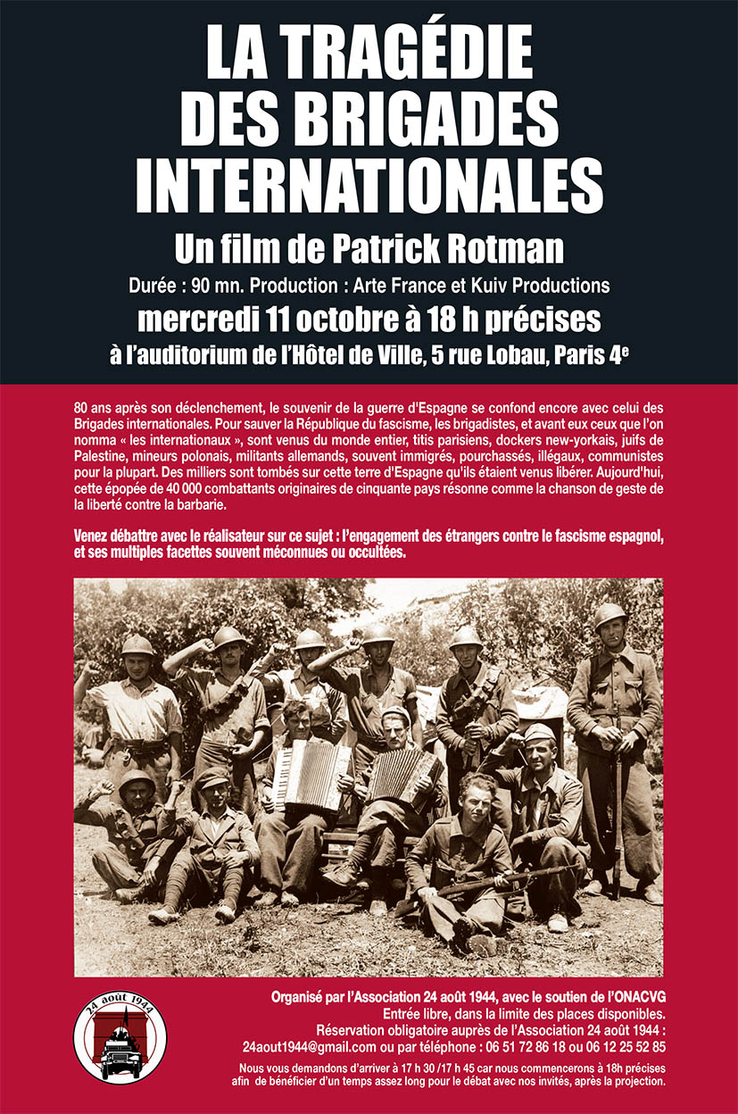 La Tragédie des Brigades internationales : À l’auditorium de l’Hôtel de Ville, le mercredi 11 octobre, à 18h précise (arriver une ½ heure avant)