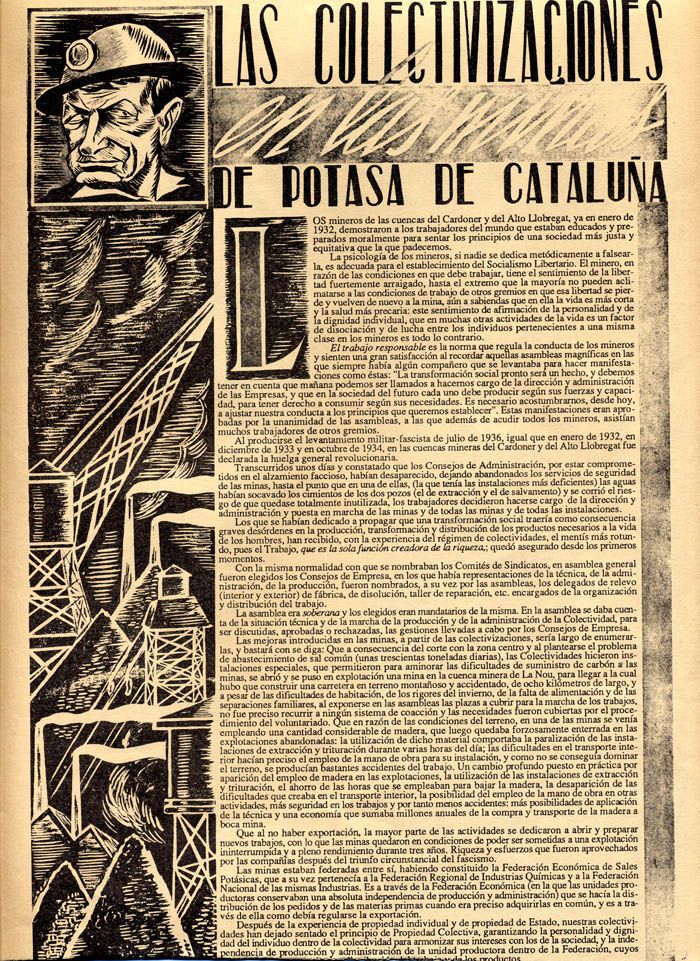 Calanda (Province de Teruel en Aragon), 26 juillet, les milices de Catalogne chassent les fascistes et on nomme un Comité révolutionnaire composé de 4 membres de la C.N. T. et de 2 membres de la Gauche républicaine, le seul parti antifasciste existant. On décide alors de proclamer le Communisme libertaire, en laissant, bien entendu, la possibilité aux individualistes de continuer à vivre comme auparavant. Mais sur les 5.000 habitants de Calanda, moins d’une dizaine peut-être restent à l’écart de la collectivité.