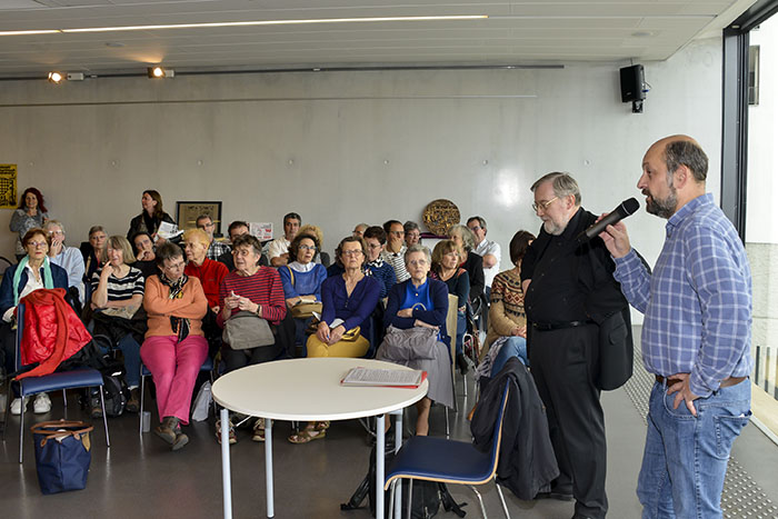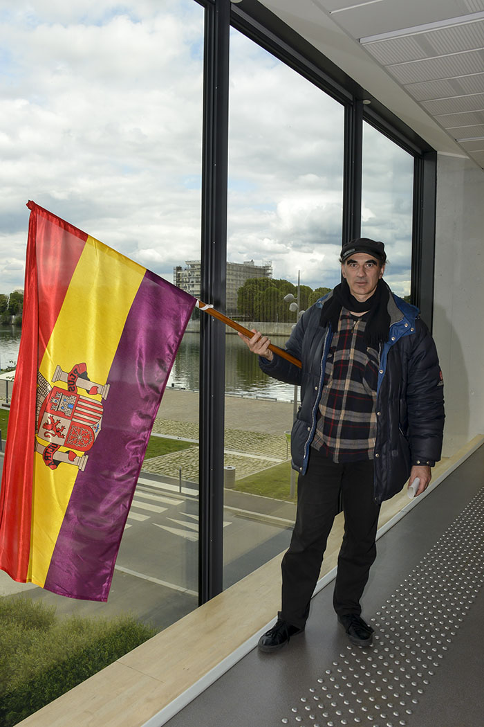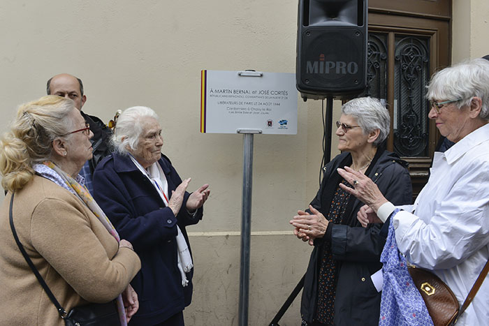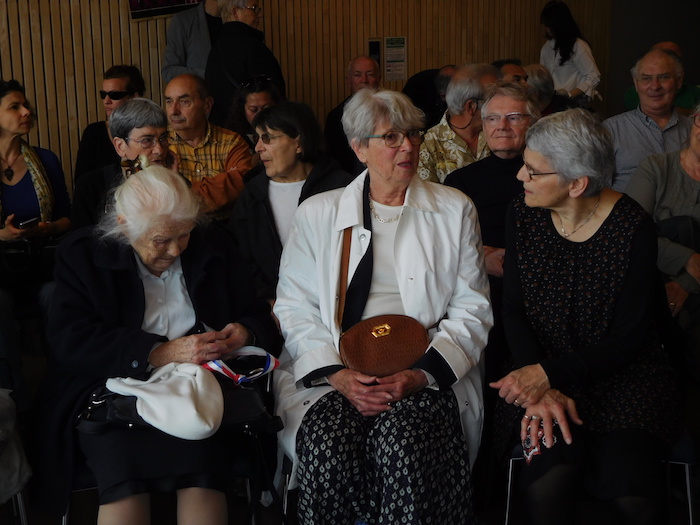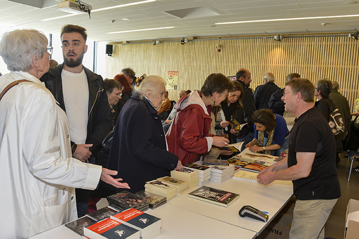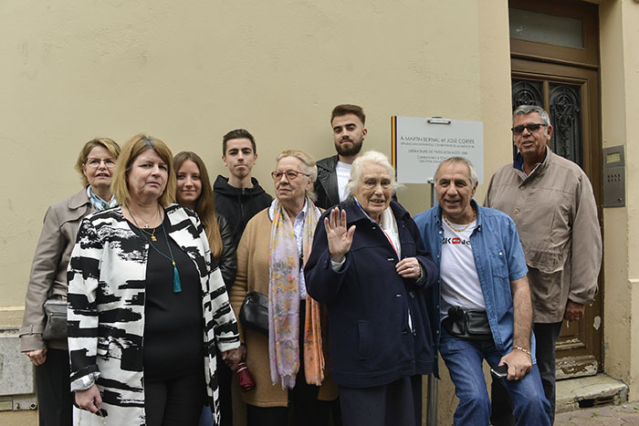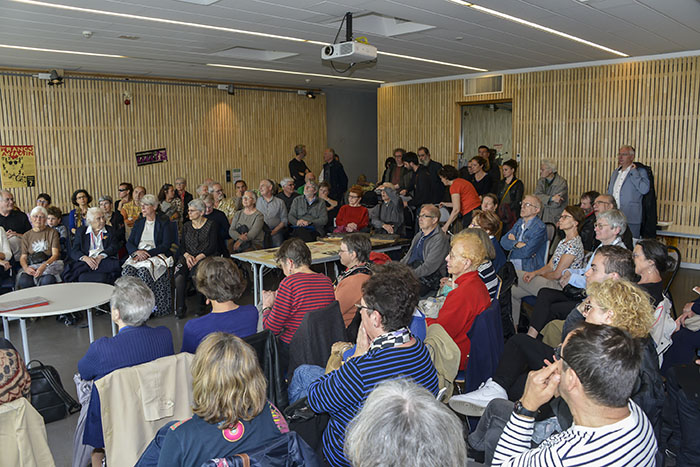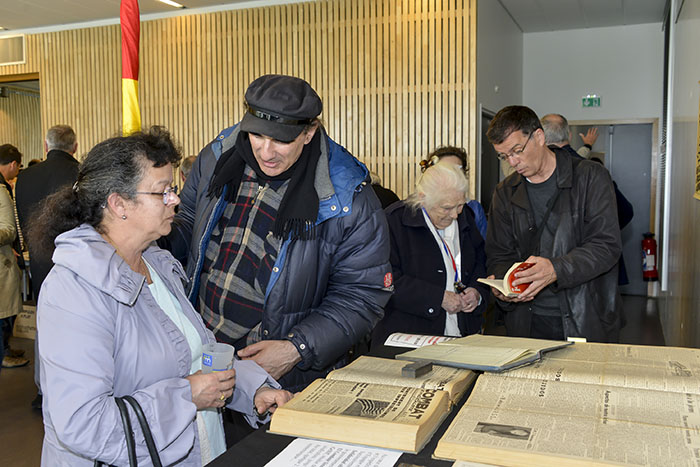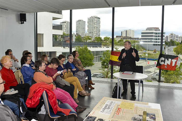 À 14h, le monde se pressait rue Émile Zola, pour écouter Madame Colette Flandrin Dronne évoquer ces deux hommes qu’elle a tant connu. « Ils étaient Ma famille! » a-t-elle déclaré d’une voix très émue. Le monde était là pour entendre l’histoire trépidante de ces hommes qui se sont immergés dans l’Histoire du monde, avec courage et détermination. Le monde était là au moment où la plaque aux couleurs de la république espagnole a été découverte pour honorer qui? ………des Cordonniers, artisans capables de tout pour vaincre la barbarie mais surtout pétris de modestie et de simplicité pour vivre leur vie « ordinaire ». Nous avons eu le plaisir d’accueillir Marie-José Cortés , fille de José Cortés et la fille de Martin Bernal avec sa petite famille. À 15h30, une foule inattendue a envahi la médiathèque. Il fallut rajouter de nombreuses chaises et malgré cet ajout, un certain nombre de personnes sont restées debout. Tous venaient écouter « la fabuleuse histoire de l’imprimerie des Gondoles ». Imprimerie fondée par les anarchistes espagnols, exilés à Choisy-Le-Roi. Elle fonctionnait sur les principes libertaires de l’Espagne de 1936: les salaires étaient identiques pour tous et elle imprimait du faire-part de naissance à toutes la presse libertaire espagnole en exil et même la presse anarchiste française. Elle faisait paraitre des revues, des ouvrages scientifiques, des romans… et toute sorte de publications plus subversives les unes que les autres. L’imprimerie des Gondoles vivait avec son temps. Elle reflétait l’expression de la politique d’époque, elle retraçait les luttes sociales et à son histoire se mêlait également l’histoire de la presse et des parutions libertaires espagnoles, et ses fluctuations…  Alain Doboeuf, historien du mouvement anarchiste espagnol, a su captiver son auditoire. Il a conté par le menu : la presse en exil, les luttes à travers les affiches et les tracts que l’imprimerie déversait au gré des luttes sociales et politiques, l’innocence des faire-part qui amélioraient l’ordinaire des imprimeurs et toutes ces publications qui alimentaient la politique de l’époque…
