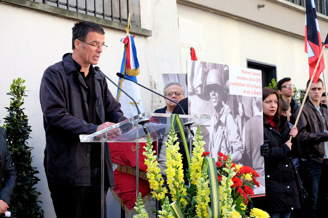 Madame Vieu-Charier a longuement évoqué l’engagement anarchiste de Manuel Lozano. Elle a également établi un judicieux parallèle avec les exilés d’aujourd’hui, leur grande détresse et le manque d’accueil de la part des pays européens dont la France. Cette cérémonie s’est déroulée en présence d’élèves de trois lycées : Le lycée professionnel Armand Carrel du 19e arrondissement; Le lycée d’enseignement général Montaigne du 6e arrondissement ; Le micro-lycée de Vitry sur Seine. Deux élèves de ce dernier, Waeel Abichou et Léo Lozano ont lu deux poésies de Manuel Lozano, poète ouvrier, dont un en espagnol, après avoir décliné ce que fut l’auteur et ce qu’il représente encore à leurs yeux. Au dévoilement de la plaque deux élèves de chaque établissement étaient présents. Ensuite, l’association 24 août 1944 rappela les enjeux du travail de mémoire et l’importance de transmettre aux jeunes générations ce que fut l’idéal de ces hommes et de ces femmes. Ils luttèrent dix longues années les armes à la main contre les fascismes et continuèrent à porter leurs résistances et leurs espoirs durant les quarante années de la dictature franquiste, envers et contre toutes les puissances du monde qui s’en accommodaient. Au nom de la CNT française, Aimable Marcellan a clos cette cérémonie en expliquant l’existence d’après guerre de Manuel, ce que fut sa fidélité à son idéal, fréquentant les lieux parisiens du milieu anarchiste espagnol tels le 24 rue Sainte Marthe et plus tard le 33 rue des Vignoles. Cet endroit reste encore aujourd’hui un espace populaire où se forge les luttes syndicales et où évoluent artistes et associations de culture et de mémoire vivante.