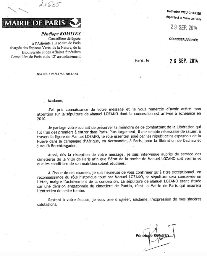 Le 26 septembre nous avons reçu une réponse de madame Pénélope Komitez qui stipule entre autre, « qu’à titre exceptionnel, en reconnaissance du rôle joué par Manuel Lozano, sa sépulture sera conservée en l’état, malgré l’achèvement de la concession « . « C’est la Mairie de Paris qui assurera l’entretien de cette tombe . » (voir document joint)