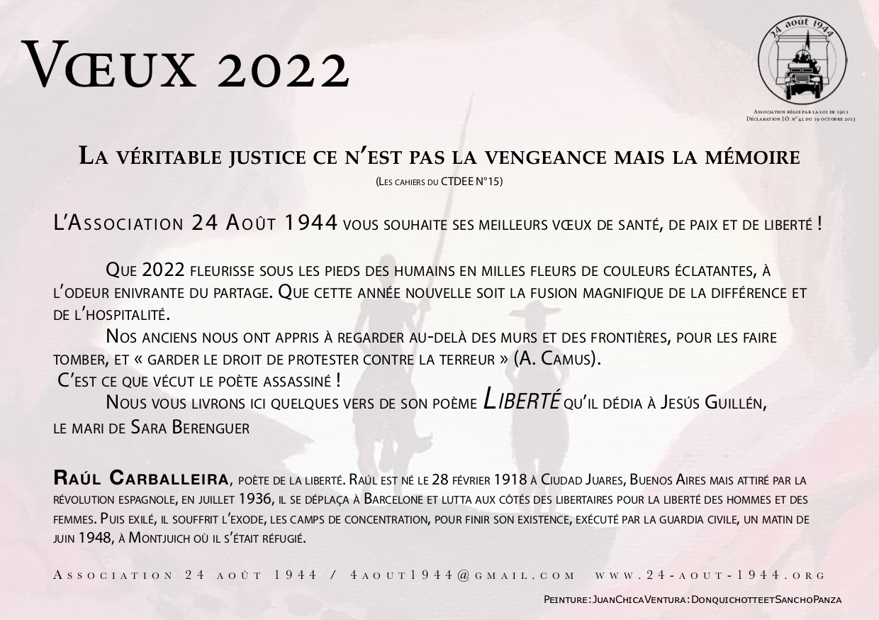 Pour 2022 avec tous nos vœux de santé pour éradiquer ce virus liberticide, l’association 24 août 1944, vous souhaite une année de paix, de solidarité et de partage, aux couleurs de cet espoir qui doit nous réunir plus que jamais.