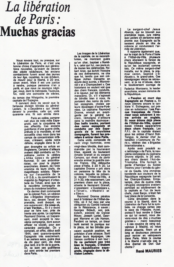 Il rapporte également que, sur le trajet de la Porte d’Italie à l’Hôtel-de-Ville, plusieurs chars arboraient le fanion de la République espagnole, et qu’on les acclamait comme tels. Ce même sergent-chef installa, sur la place, le premier canon, baptisé « El Abuelo », le grand-père. Ces témoignages vécus se retrouvent, si je ne m’abuse, dans le bouleversant ouvrage de Federica Montseny, la leader anarchiste, ancien ministre de la République : « Passion et mort des Espagnols en France ». Et nous citerons encore le tankiste V. Etchegaray, qui précise en substance : Les forces françaises de l’intérieur nous saluèrent à notre arrivée en anglais. Et nous étions déjà place de l’Hôtel-de-Ville, quand nous vîmes apparaître deux chars français. Les F.F.I. de la capitale étaient sous les ordres d’Henri Rol-Tanguy, le dernier chef du bataillon « Commune de Paris », vétéran des « Brigades internationales ».