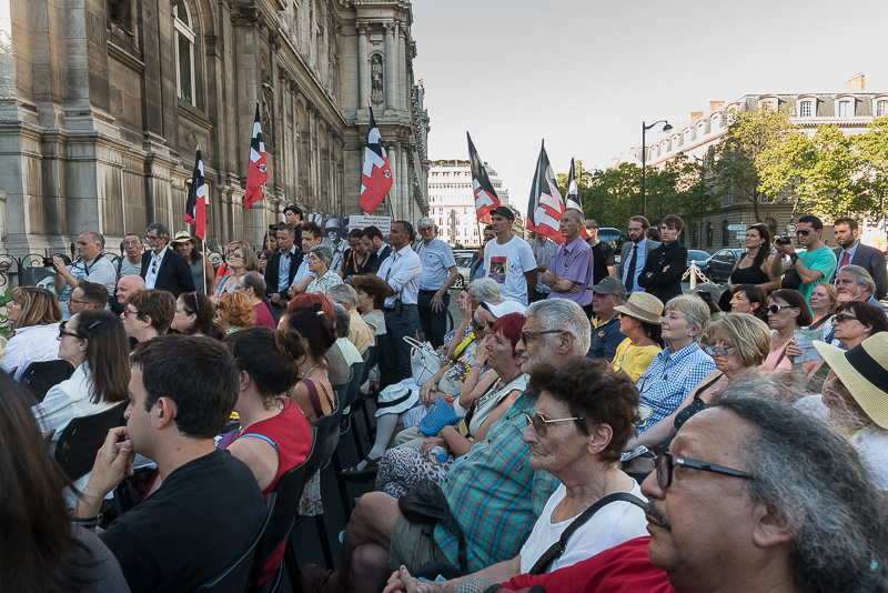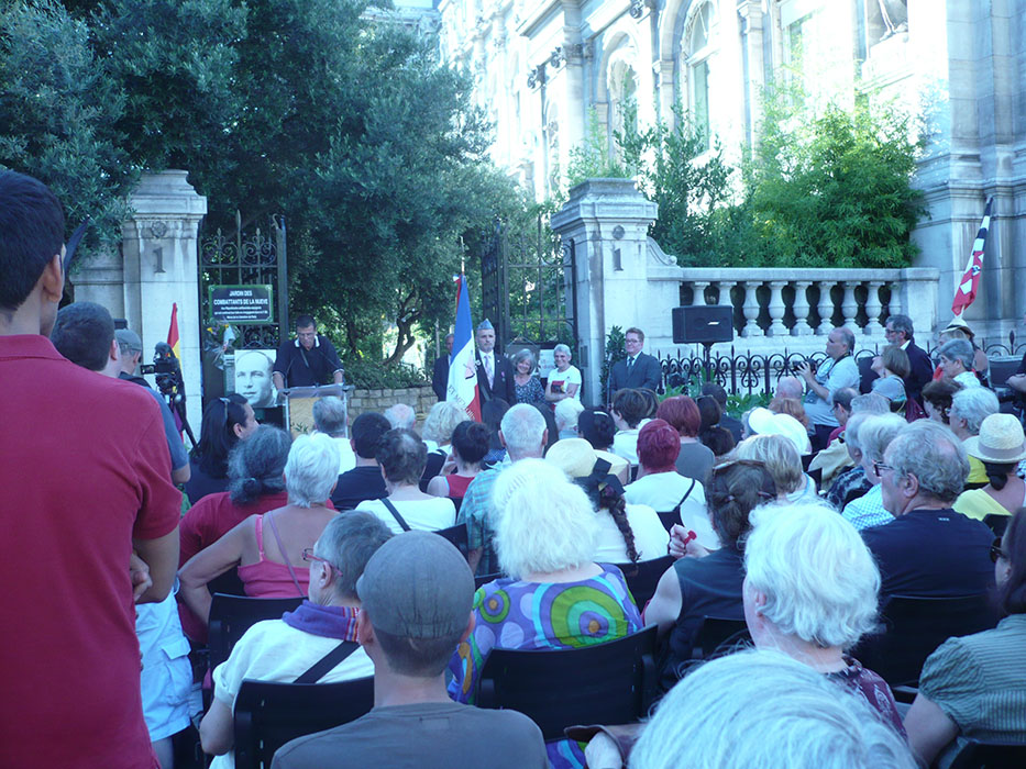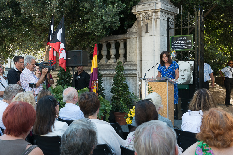Mais cette autre guerre, notre guerre, ils allaient la gagner. Regroupés dans la neuvième compagnie de la division Leclerc, « la Nueve », ils seront parmi les premiers à rentrer dans notre Ville et à rejoindre son Hôtel de ville, le 24 août 1944. Malgré les souffrances, malgré les désillusions, ils étaient restés fidèles à une même valeur, à un même objectif : la liberté. Leur détermination était une arme invincible, leur persévérance faisait d’eux des combattants hors du commun ; comme le furent aussi les Arméniens et tous ces combattants antifascistes qui nourrirent la Résistance française et contribuèrent à la Libération de notre pays. (…) Au nom du Peuple de Paris, je m’incline aujourd’hui face au courage de ces combattants. »