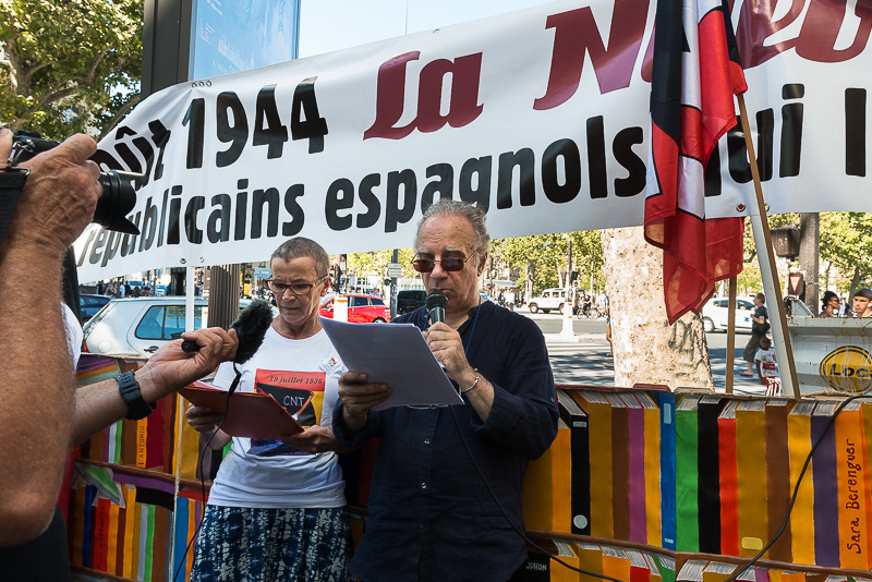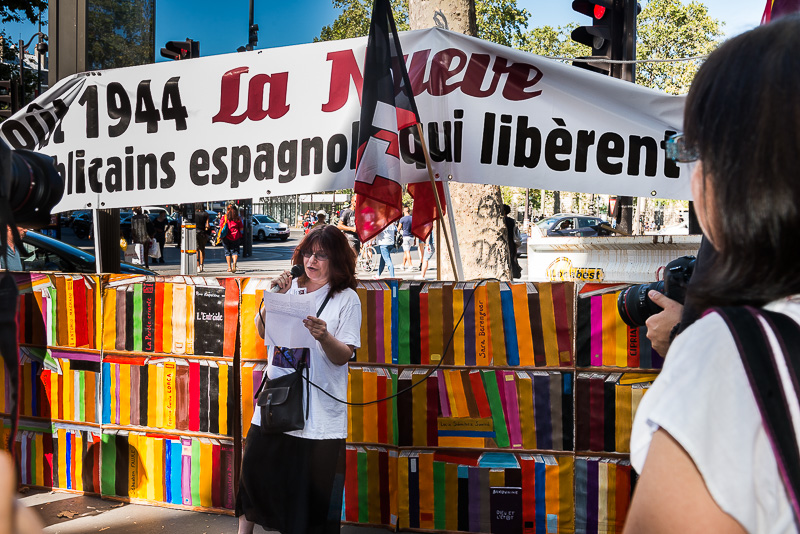 Nous descendons nos panneaux chamarrés et tout à coup apparaît, sous le regard médusé des piétons, une belle barricade de livres peints sur des palettes de bois. Notre slogan éclate comme une évidence: « La barricade des livres et du savoir » La culture et la mémoire, meilleurs remparts contre les dictatures… Nous sommes environ une centaine pour ce nouvel hommage aux Espagnols de la Nueve, entrés le 24 août 1944 dans Paris en avant-garde de la division Leclerc. En 1944, leur arrivée dans Paris insurgé est un souffle d’espoir et une aide précieuse pour la Résistance. Cela fait maintenant trois années de suite que nous rappelons aux parisiens cet événement du 24 août. Nous avons choisi cette année de démarrer place de la République car à cet angle des rues Béranger et Temple, se dressait une barricade de résistants FFI et FTP parisiens et les hommes de la Nueve sont intervenus là, à leur demande pour briser les défenses allemandes qui tenaient la place de la république. Après les remerciements et présentation du déroulé de la journée, Serge et Marie racontent à tous ceux qui se pressent autour d’eux l’histoire de cette journée du 25 août où après le central de la rue des Archives, les hommes de la Nueve interviennent place de la République pour dégager les défenses ennemies. (Doc 02). Juan nous lit le témoignage de Victor Etchegaray, membre de la Nueve et engagé dans cet accrochage parisien meurtrier. Ce témoignage a été recueilli par Federica Montseny en 1949. (Doc 03) Et voici la petite note de poésie, Léo un jeune homme de 2O printemps, nous livre deux beaux poèmes écrits par des collégiens de 3e de Mouans-Sartoux, dans les Alpes-Maritime : (Docs 04 et 04 Bis). Ils ont été inspirés par le travail de mémoire que nous avons réalisé avec eux et leur professeur Annie Fiore comme tous les ans à partir de l’exposition Les républicains espagnols pour témoins. Ces poésies ayant été écrites sous l’œil vigilant de leur professeur en espagnol, Rosine joint sa voix à celle de Léo pour nous en donner lecture en castillan. Et enfin avant de quitter les lieux en cortège pour rejoindre l’Hôtel de ville Cristine nous brosse un tableau succinct des actions que notre association a mené au cours des huit premiers mois de l’année 2016. Tandis qu’Agnès, notre secrétaire, nous met l’eau à la bouche pour ce que nous projetons dès l’automne dont notre ciné-club et en 2017. (Doc 05) Ce fut la dernière intervention à la République. Rythmé par les chants de la Révolution espagnole, les copains de la CNT présents nous ont aidé (enfin ont organisé le pliage et le rangement du matériel : panneaux de la barricade, table, chaise…) comme ils avaient d’ailleurs organisé leur déballage. Un grand merci à elles et eux ! Nous nous sommes mis en route, banderole de la Nueve en tête, drapeaux CNT flottant sur le plateau du camion ou dans les mains des jeunes. Le parcours très agréable sous les yeux ébahis des promeneurs : Rue du Temple, rue Turbigo, rue Beaubourg, rue Rambuteau et rue des Francs-Bourgeois, rue Vieille du Temple, rue du Pont Louis Philippe, rue François Miron et esplanade de la mairie rue Lobau, devant le jardin dédié aux combattants de la Nueve.   Notre cortège s’étire dans les rues du Marais, nous sommes près d’une centaine à suivre cet hommage. Les conversations vont bon train tout au long du parcours où nous distribuons aux personnes sur les trottoirs, des dossiers qui présentent notre association, son action et l’explication de cette barricade : La jonction des forces alliées et de la résistance dans le combat pour la Liberté. Une halte s’impose au coin de la rue du Temple et de la rue des Archives, exactement là où a eu lieu un des combats les plus meurtrier du 25 août 1944, devant le fameux central téléphonique, conquis finalement par les résistants parisiens et les soldats de la Nueve. Aimable nous livre ce récit que la bâtisse garde jalousement en ces murs. (doc 06) Et pour une note poétique, c’est encore Léo qui lit en français un poème de Miguel Unamuno et un autre de León Felipe (docs 07 et 07 bis). Notre arrivée rue Lobau est très colorée. Bientôt notre barricade est à nouveau installée sur le trottoir, agrémentée des portraits des hommes de la Nueve. Comme c’était prévisible, des personnes sortant de leur travail nous rejoignent devant le 3 rue Lobau, face à la grille du jardin de la Nueve. Nous serons environ 200 personnes à écouter les diverses allocutions qui vont se succéder. Nous mettons en documents les interventions prononcées par les membres de notre association. (docs 08 / 09) Nous avons dédié cet hommage à Luis Royo Ibañez, qui est décédé le 23 août 2016, la veille, combattant et survivant de la Nueve. Sont intervenus dans un hommage au message de fraternité et d’antifascisme, Christophe Girard, maire du 4°, un hommage tout personnel dont nous vous donnons ici quelques extraits et nous vous offrons le manuscrit du discours : « (…)Ceux dont le capitaine Dronne disait qu’ils s’étaient bien battus, avec énormément de courage et une grande expérience (…), engagés contre le franquisme, la dictature , le totalitarisme (…) Ces êtres qui ont sublimé leur vie pour la liberté, la leur et celle des autres, la nôtre. (…) Ses compagnons furent les premiers à entrer dans Paris. Cette 9e compagnie, la Nueve, enrôla 146 républicains espagnols, souvent anarchistes, aussi socialistes, communistes ou indépendant sans parti. Des hommes libres. (…) Inspirons-nous plus que jamais de ces républicains espagnols à la pensée universelle (…) Pour conclure comment ne pas penser à Federico García Lorca, assassiné dans la nuit du 17 au 18 août 1936, par les miliciens franquistes (…) extraits de Doña Rosita : Rien n’est plus vivant qu’un souvenir et Lo más Importante es vivir ! 