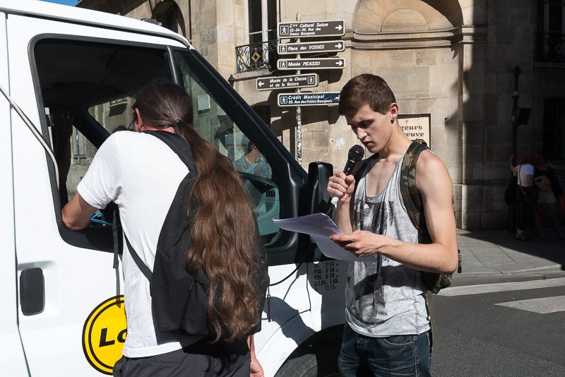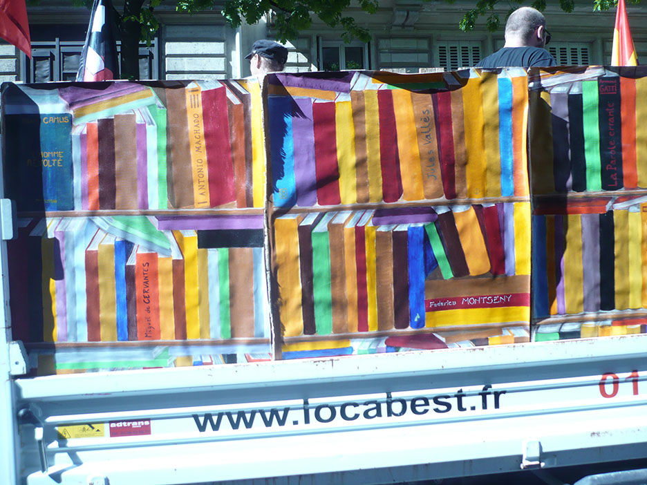 La chaleur accable Paris, d’un 37° bien prononcé. Malgré le soleil, la place de la république bruisse des allers et venues des passants, touristes curieux ou parisiens allant à leurs affaires. Mais tient ! Qui sont ces gens qui s’arrêtent, s’attroupent au pied d’un camion chamarré aux couleurs vives de couvertures de livres peintes sur une grande toile de chaque côté du véhicule
