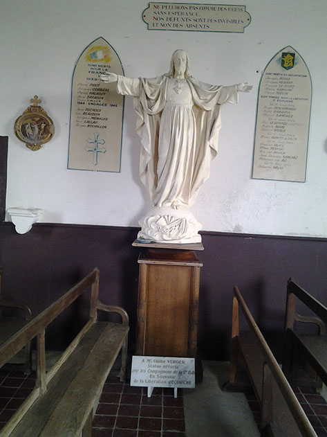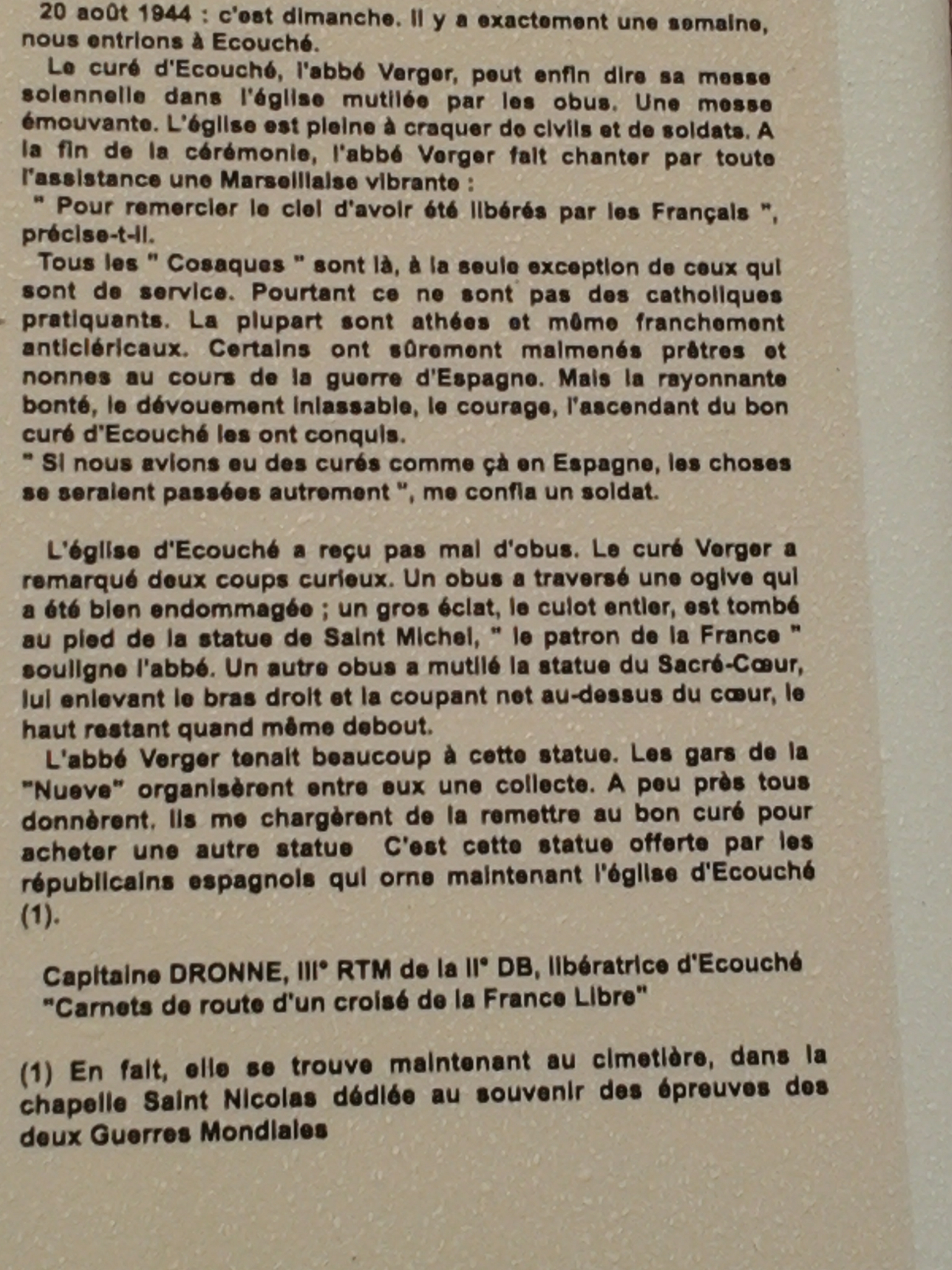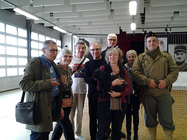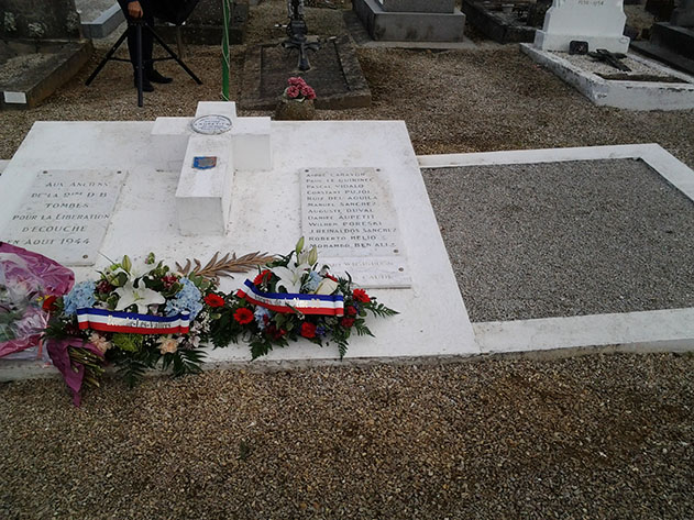 11H00 le monde se presse au cimetière. C’est à première vue une commémoration exceptionnelle qui sort des célébrations annuelles habituelles. Il y a foule, une forêt de drapeaux de régiments différents et notamment tous ceux qui ont composé, en leur temps, la si célèbre 2e Division Blindée du général Leclerc. Après l’intervention générale de Monsieur Bayard, président de l’association de l’Orne: «  Vive la résistance « , maitre de cérémonie de ce dimanche et venu d’Alençon pour l’occasion, il y eut le dépôt des gerbes, dont la nôtre. Puis la parole est à notre association. C’est Serge qui s’y colle. Avec comme discours, le témoignage délivré par Miguel Solé Pladellorens à son fils sur la bataille d’Écouché. Un moment plein d’émotion surtout, lorsque la voix s’étrangle à l’évocation de la mort de Constantino Pujol, qui s’éteint dans les bras de son ami Pedro Solé, le frère de Miguel. Serge souligne également la présence parmi nous de Mary y Luz Cariño-Lopez et de Marie-José Cortés, toutes deux filles de combattants de la Nueve. Cette lecture se termine sous les applaudissements, et beaucoup de personnes dans l’assistance viendront nous voir pour nous remercier de ce témoignage. Beaucoup ont appris ce que fut réellement le rôle des Espagnols antifascistes lors de notre intervention. Après diverses prises de paroles, dont l’évocation de la présence du 501e régiment de chars de combat (RCC) et le son des marches militaires, qui accompagnent généralement ces commémorations, nous sommes tous invités à nous rendre près du char Sherman Massaoua qui veille à l’entrée du village, au coin de l’avenue du Général Leclerc. il est surprenant de voir combien les heures de la Libération ont marqué cette cité, car beaucoup de noms de rue, de place portent des noms d’officiers de la 2e DB, en hommage à leur courage et à leur sacrifice. Avant de quitter le cimetière nous faisons une escapade, en petit comité, jusqu’à la chapelle Saint Michel, qui se trouve dans le cimetière. Elle contient à l’intérieur, une statue du Sacré-Cœur, payée par les Espagnols de la Nueve au curé Verger qui célébra la messe de la libération. Messe à laquelle assistèrent même nos anticléricaux espagnols (voir le récit qu’en a fait le capitaine Dronne et qui est reproduit au milieu des ruines de l’église au cœur de la ville). Enfin, nous nous dirigeons vers le Massaoua. Ce char appartenait à la 2e DB, il se plaça à l’entrée de la petite ville, et de cette position tira tout ce qu’il put. Tombé en panne, il resta sur place. Le maire de l’époque et le conseil municipal demandèrent alors aux armées la permission de le garder là. Il devint symbole de la Libération d’Écouché. Sur sa gauche, a été posée une plaque en l’honneur des Espagnols antifascistes de la Nueve qui ont tenu le siège du 13 au 18 août 1944, attendant des renforts. C’est dans la salle du vin d’honneur offert par la mairie, que toutes et tous ont pu se promener parmi les portraits des hommes de la Nueve, peints par Juan Chica-Ventura. Ils trônaient au mitan de la salle des fêtes ; face aux tables dressées et aux convives curieuses de graver ces visages et leur épopée dans leur mémoire. Notre association a pris encore une fois la parole, pour expliquer d’où venaient ces hommes, ce qu’ils avaient vécu avant d’arriver à Écouché, après : la libération de Paris, la campagne d’Alsace, l’arrivée au nid d’Aigle de Hitler et surtout leur déception de ne pas continuer pour déloger le dictateur qui sévissait sur leur terre natale, l’Espagne. Puis ce fut l’heure des échanges à propos des événements, des échanges de contact, avant d’aller nous restaurer tous ensemble. L’association a offert au président des anciens combattants et à Monsieur Bayard, un lot des cartes postales représentant les portraits peints par Juan, et nous nous sommes promis de garder contact pour d’autres évocations de ces réfugiés particuliers !