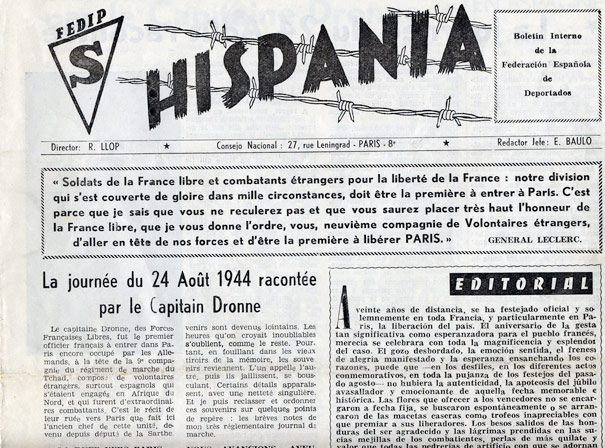 Un agent de police vint me trouver et me demanda d’aller avec lui à la préfecture de police. Je passai le commandement à Granell. Outre Granell, il y avait là le sergent-chef Bernal[[Martín Bernal, Aragonais de Saragosse, un colosse tranquille, ancien toréador sous le nom de : Larita Segundo, évadé des prisons franquistes après la guerre civile, il traverse à pied l’Espagne et passe la frontière en septembre 1939, par les Pyrénées. Il s’engage dans l’armée française, et à la fin de la drôle de guerre, il rejoint les troupes de Leclerc. Sergent-chef, par son courage il s’impose rapidement dans La Nueve. Décoré de la Croix de Guerre avec étoile d’argent pour avoir affronter un ennemi supérieur en nombre en faisant de nombreuse victimes dans leur rangs et en sauvant un compagnon blessé.]], l’adjudant-chef Neyret, l’adjudant-chef Caron, le sous-lieutenant Elias.